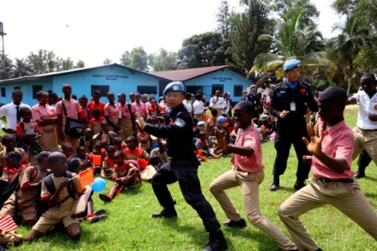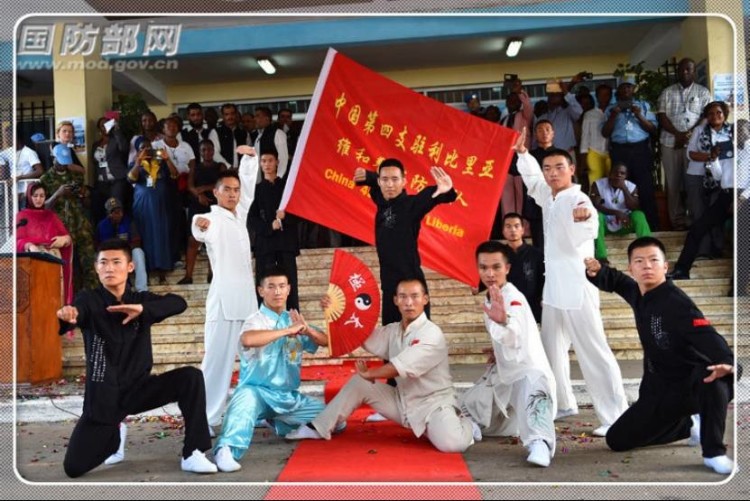 中国第四支驻利比里亚维和警察防暴队队员在表演中国功夫(来源:国防部网)