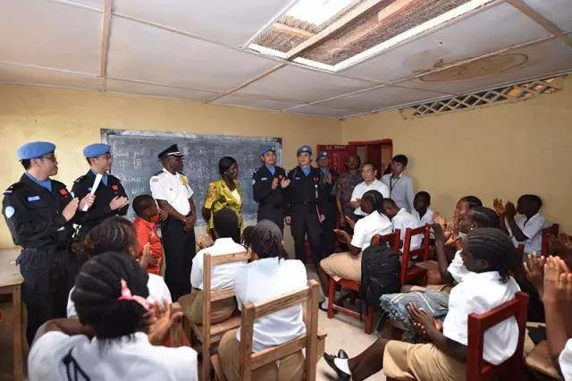中国维和警察防暴队还经常到驻地的学校开展爱心助学活动,他们不仅代表国家捐赠了书包、文具、足球、水壶等用品,还积极与师生进行文化交流,防暴队教孩子们写汉字、唱中文歌、学习中国功夫……学生们都被中国文化深深吸引。