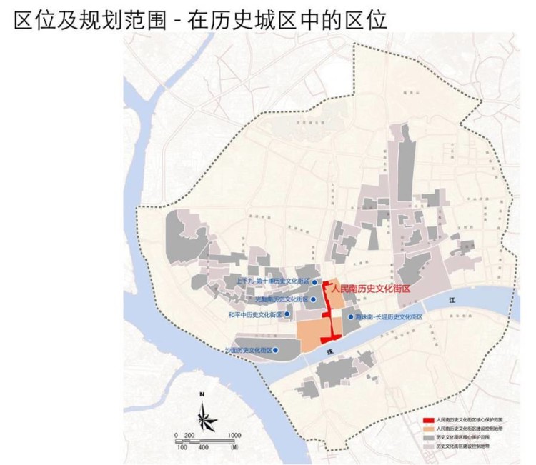 核心保护范围包括:人民南路沿线、沿江西路与西濠二马路之间街区、沿江西路广州邮务管理局旧址及以东地区、文化公园历史建筑群、豆栏上街和平东社区、濠畔清真寺周边等,面积13.26公顷。