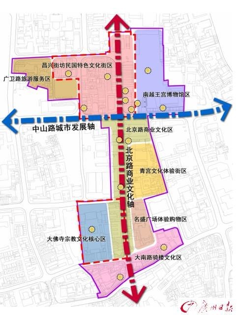 八大功能片区:广卫路旅游服务区、昌兴街坊民国特色文化街区、南越王宫博物馆区、北京路商业文化区、青宫文化体验区、名盛广场体验购物区、大佛寺宗教文化核心区、大南路骑楼文化区。