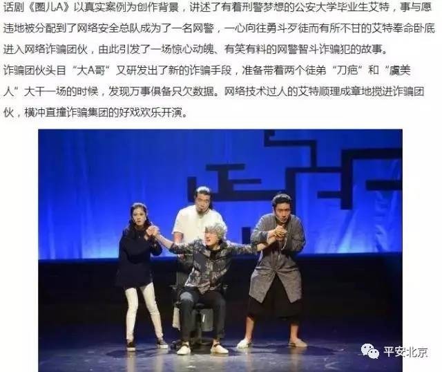 8、深入群众创新形式,北京网警在全市举办防范电信网络诈骗宣传巡回展,全国首创防诈骗题材话剧《圈儿A》走进北京大学。