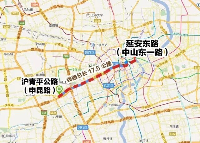 延安路中运量公交线路走向为沪青平公路(申昆路)——外滩(中山东一路),全长约17.5km,全线设站25组,平均站间距730m。