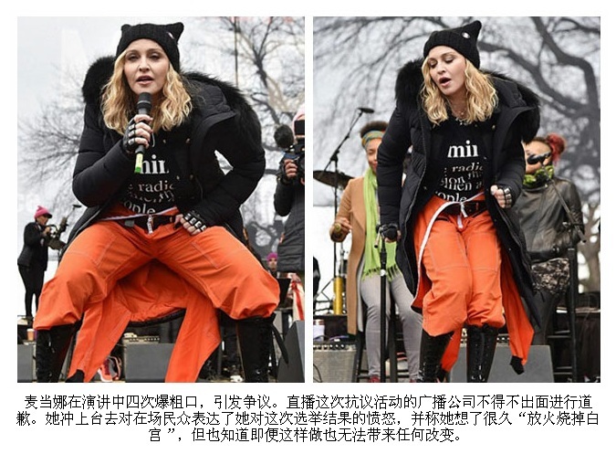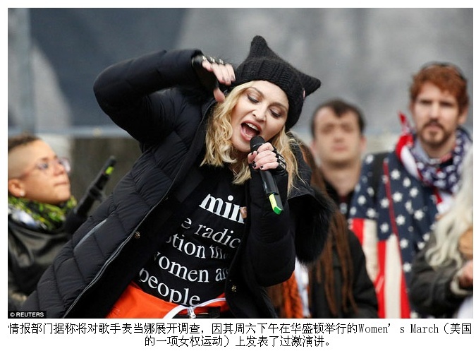 据《每日邮报》报道,情报部门据称将对歌手麦当娜展开调查,因其在周六下午在华盛顿举行的Women’s March(美国的一项女权运动)上发表过激演讲。这名巨星在演讲中四次爆粗口,引发争议。她冲上台去对在场民众表达了她对这次选举结果的愤怒,并称她想了很久“放火烧掉白宫”,但也知道即便这样做也无法带来任何改变。直播这次抗议活动的广播公司不得不出面进行道歉。