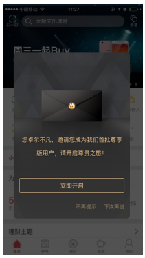登录招商银行APP5.0,在首页初步观感上,5.0版本整体页面风格与上代产品区别不大,依然是简洁明快的互联网字线风,给人感觉萌萌哒,结合最下方精美诱人的吃喝玩乐图片,品牌活力自然洋溢。最突出的两个变化,一是实现了高端用户定制页面,二是理财顾问第一时间的驻场“露出”。不同账户等级的客户看到的页面有所不同,金葵花级别的客户刚升级5.0的时候,会收到一封尊享版用户的邀请函,点击后即可进入另一种“装修风格”的“包间”(页面),颇显诚意。