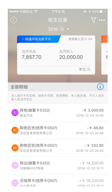 在“首页”频道点击“收支”栏目,进入后可看到你的账户收支明细。与其他银行的APP相比,招商银行APP可以在“收支记录”里直接查看你的收支明细,一目了然,无须像其他银行般要输入时间段查询。这个体验是非常友好的,其实就是这么一点基本的人性化操作,国内很多的大银行都没有实现(除了技术原因更是思维原因)。