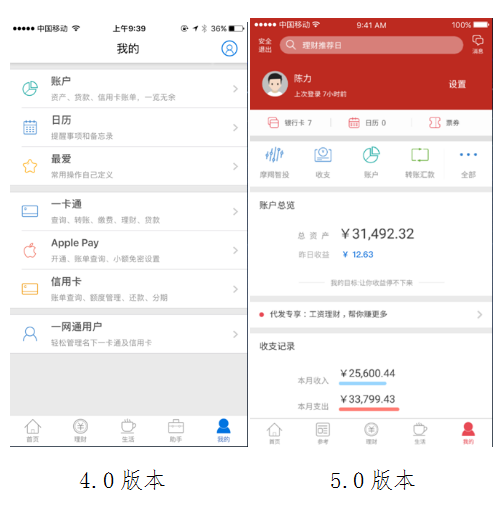 “我的”频道承担了个人管理中心的功能,也有较大的调整。4.0版本是账户、日历、一卡通等多个栏目分条陈列,5.0版本则变为更加清晰的用户视角,顶端位置显示用户头像和昵称,下方按版块呈现不同功能,资产和收支情况更是直接展示出来,一目了然,无须再点进二级菜单查询。其中“银行卡”按钮直接显示用户目前绑定的银行卡数量,点进去就可以管理所有名下卡片。而功能栏位更是直观展示转账汇款、账号、收支等最常使用功能,方便用户随时“随地”动手办事。
