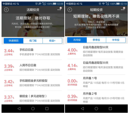 就个人而言,“理财”频道是招商银行APP5.0最值得玩味的“我的地盘”。尤其“我的关注”置于页面的中央,添加自己关注的理财产品后,可一眼看到类似“自选股”功能一样的产品列表,每个产品还附带预期收益率在内的一句话摘要介绍,做到关注你所关注的。而产品分类上招行摒弃了传统的产品类型属性分类,按照用户“用钱”的习惯分为活期、短期、长期投资三大类,各取所需。