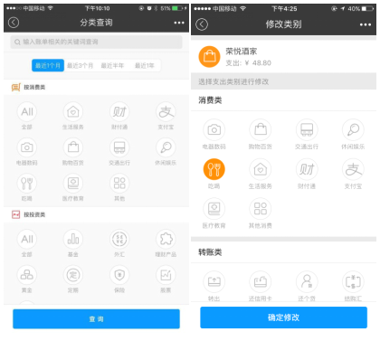 点击“收支记录”页面右上角的漏斗状按钮,就进入筛选查询页面。页面有消费、投资、转账、收入四大类,细项更多达数十项,基本囊括生活中可能会遇到的收支场景。这个功能甚至比支付宝还要全面,支付宝目前只能记录你支出和转账的详情,并没有收入的全面数据,因为人的工资等收入,首先是进入银行账户而不是支付宝账户的。另外,纵观国内其他银行,目前还没有重视这一优势数据的开发。