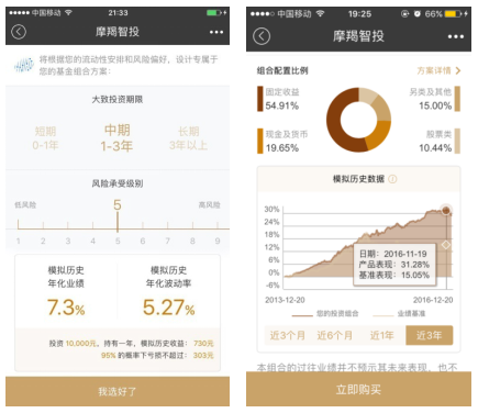 首页点击进入“摩羯智投”服务,系统提示我们要选择投资期限和风险偏好,设定后系统会自动运算设计出专属的基金组合方案。有趣之处在于,你并不需要知道其每天107万次计算怎么跑的,只管好好挑选心仪组合。点击“我选好了”,系统后台开始运算,很快便给出了“最优的基金组合方案”。