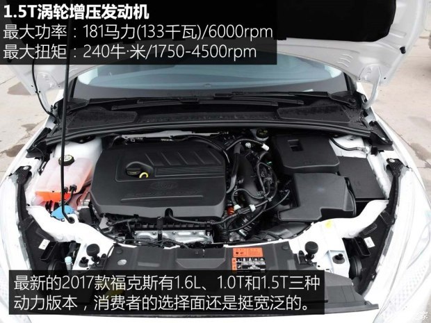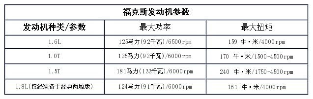 如果想追求好一些的动力可以选择1.5T的版本,而如果仅是作为代步使用,对燃油经济性的需求更高的话则可以在1.6L或1.0T二者中进行选择。另外,在售的两厢经典版福克斯搭载的是1.8L自然吸气发动机,变速箱则有5MT和4AT两种。