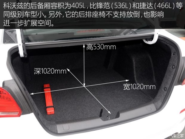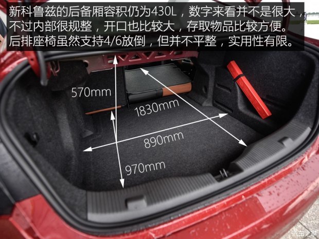 两款车的后备厢尺寸都不突出,科鲁兹低配的两款车型后排座椅仅支持整体放倒功能,不过好在内部造型还算规整,空间利用率挺高,侧壁上还设计有很实用的挂钩,应对一般的装载需求是没有问题的。而科沃兹全系后排座椅不能放倒拓展装载空间,对于一台纯家用定位的车型来说实用性有些欠缺,大家在购买之前应该充分加以考虑。
