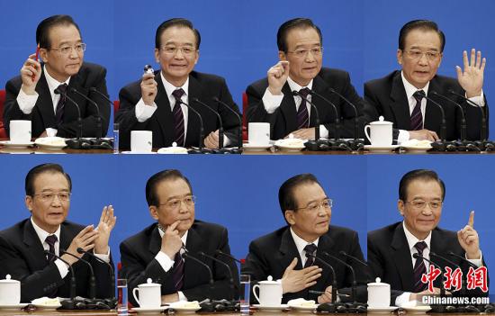 3月14日上午,十一届全国人大五次会议闭幕后,国务院总理温家宝在北京人民大会堂金色大厅与中外记者见面并回答提问。图为温家宝总理答记者问表情拼图。中新社记者 杜洋 摄