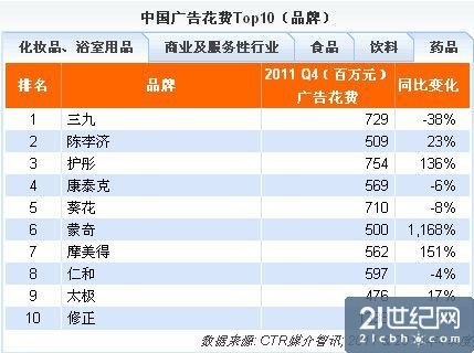 据中国领先市场研究公司CTR发布的最新数据,在医药行业中,2011年第四季度修正药业投入广告花费1.338亿元,居药品行业第一位,是排名第10位的太极集团同期广告投入花费的近3倍。