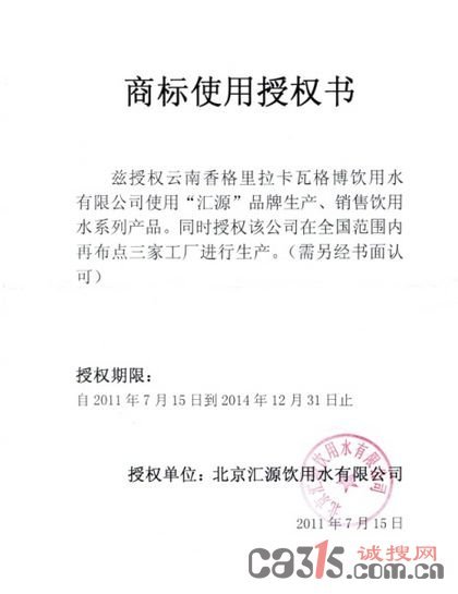 祝强称,汇源饮用水公司只是汇源集团旗下生产桶装水的一个子公司,并不是汇源商标的所有人,却以授权生产的方式收费,涉嫌商标授权欺诈。