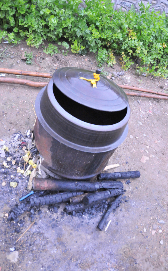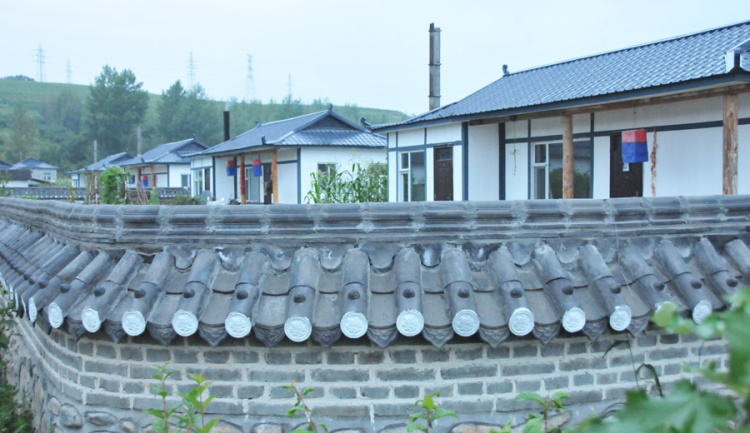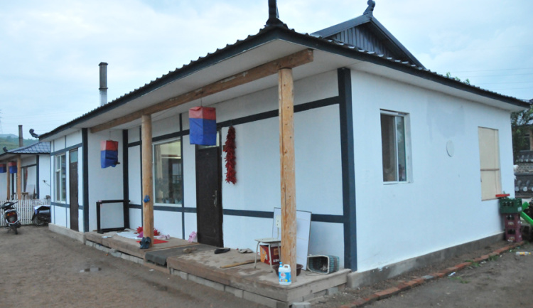 金达莱民俗村村中,传统朝鲜族房屋,歇山屋顶,灰瓦白墙,房柱外露,木制烟筒,满屋大炕。新华网戴琳凌摄
