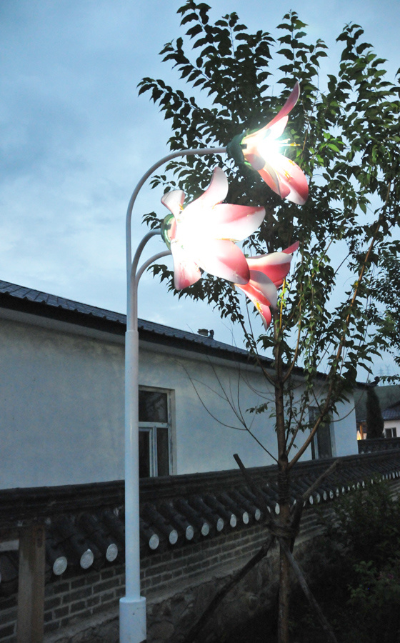 金达莱民俗村村中路灯以金达莱花为原型。金达莱花是中国延边朝鲜族自治州的州花,延吉市的市花。新华网戴琳凌摄