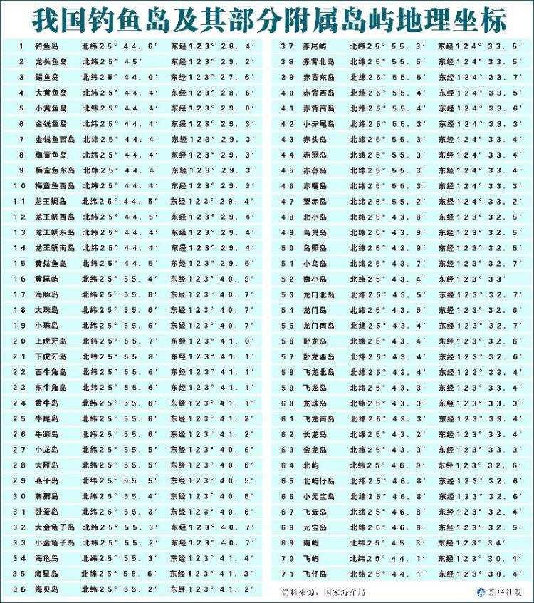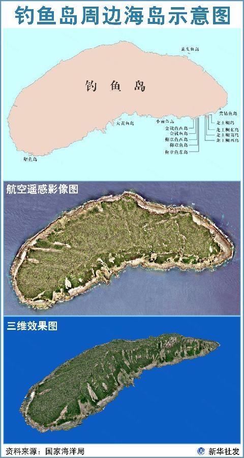 9月15日,国家海洋局在其网站公布了我国钓鱼岛及其部分附属岛屿地理坐标,同时公布了国家海洋局海岛监视监测系统中的部分钓鱼岛及其附属岛屿位置图、示意图、三维效果图等,以便社会公众进一步了解钓鱼岛及其附属岛屿有关情况。新华社发