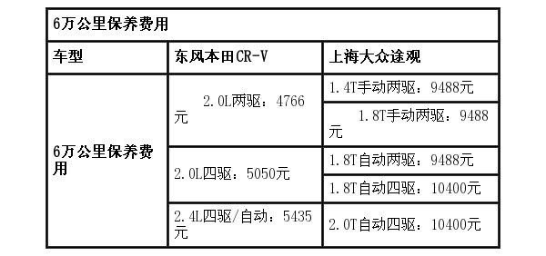 通过计算,最后得出6万公里的保养价格对比。我们可以从下列表格看出,大众途观的6万公里保养费用比东风本田CR-V要高出一半。所以,这局东风本田CR-V胜出。
