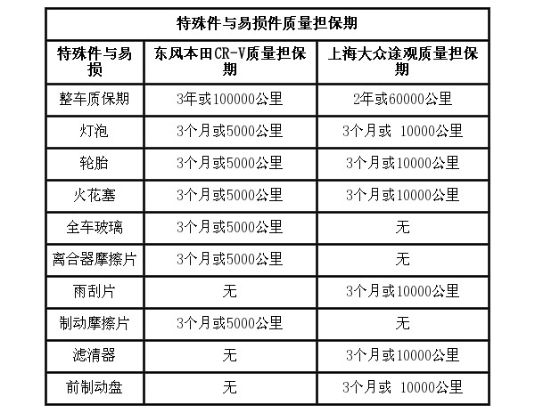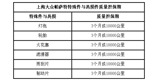 灯泡、制动片、离合器摩擦片、火花塞、滤清器、轮胎、雨刮片质保期为3个月或10000公里。既然途观和帕萨特采用相同的整车质保期,那么易损件质保期就很自然地采用相同的政策。