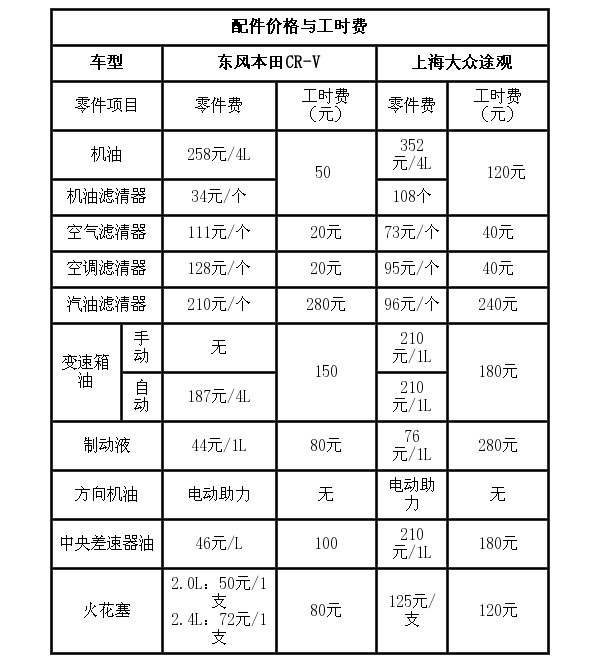德系车比日系车的保养价格高是众所周知的。我们可以翻回第一和第二页看本田CR-V和大众途观的6万公里保养费用就可以了解到大众途观的保养费用比CR-V要贵出一倍以上。配件价格不说,我们从工时费来入手,本田很多更换配件的操作徒手就可以完成,配件使用扣子固定,比较容易出现松动。而大众途观毕竟是德国车,出了名严谨。所以,在更换的配件上都是用螺丝等固定,拆卸时比较麻烦,工时费自然就高了。