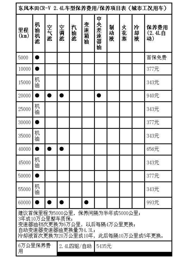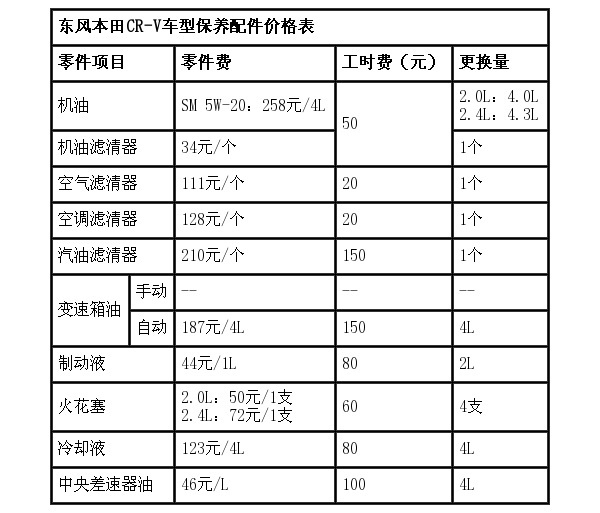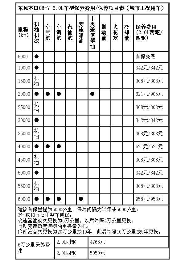 按照《保养手册》的规定,东风本田CR-V每隔5000公里进行一次保养。由于东风本田CR-V有2.0L两驱与四驱,2.4L有四驱车,所以下列表格为2.0L车型的两驱和四驱的保养价格和详细的保养情况。