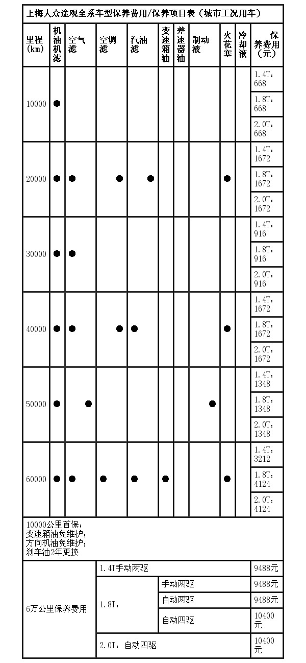 途观1.4T、1.8T和2.0T车型所采用的保养配件均相同,保养配件的价格和工时费上都是一致。