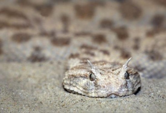 沙漠角蝰发现于中东和非洲北部地区,它每只眼睛上的小角让它很容易辨认。根据科学家所说这种蛇的毒性是不同的,它的毒性半数致死剂量范围从0.4毫克到0.1毫克,这种沙漠角蝰采用一种特别的运动方式,它把自己的压进沙中来穿行于松散的表面。我们忍不住想说的是这种蛇是一种恶魔般的毒蛇。