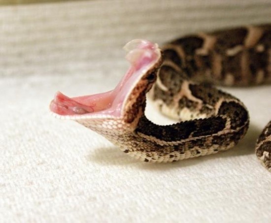 鼓腹巨蝰蛇并不是非洲毒性最强的蛇但是却被认为是导致人类死亡数最多的蛇。这是由于毒蛇通常出现在人口众多的区域而且喜好在人行道附近晒太阳。然后当然是它剧毒的毒液,半数致死剂量达到0.14mg,而且能通过长长的毒牙注射大剂量的毒液。一只平均大小的鼓腹巨蝰蛇的毒液足以毒死4-5人。咬伤的症状包括肿胀、血疱和恶心,如果不治疗就会导致细胞坏死,细胞坏死甚至能够导致坏疽。这种蛇不会为你让路,所以你最好避开它们。