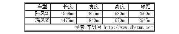 瑞风S5与陆风X6均是城市型SUV,但两款车在外型尺寸方面有较大差别。陆风X5的长宽高分别为4568x1855x1680mm,轴距也达到了2660mm。而瑞风S5的车身尺寸分别为4475x1840x1670mm,轴距为2645mm。可见陆风X5的长度优势较为明显,轴距上也小幅领先瑞风S5达15mm,这都为陆风X5的乘坐空间上创造了一些优势。