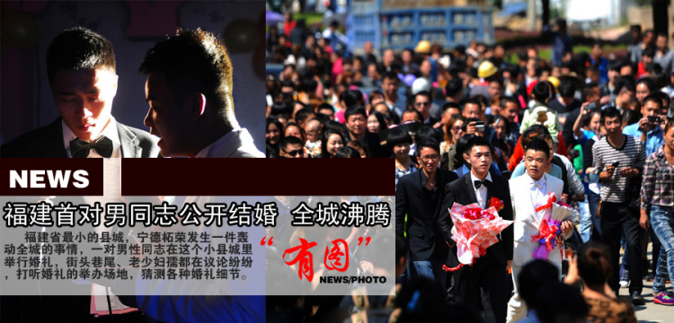 2012年10月2日,福建省最小的县城,宁德柘荣发生一件轰动全城的事情,一对男性同志在这个小县城里举行婚礼。当5辆电摩组成的迎亲队伍驶入十字街头时,全城沸腾。图为婚礼现场,两人献唱了一首《我想有个家》,全场都跟着唱了。