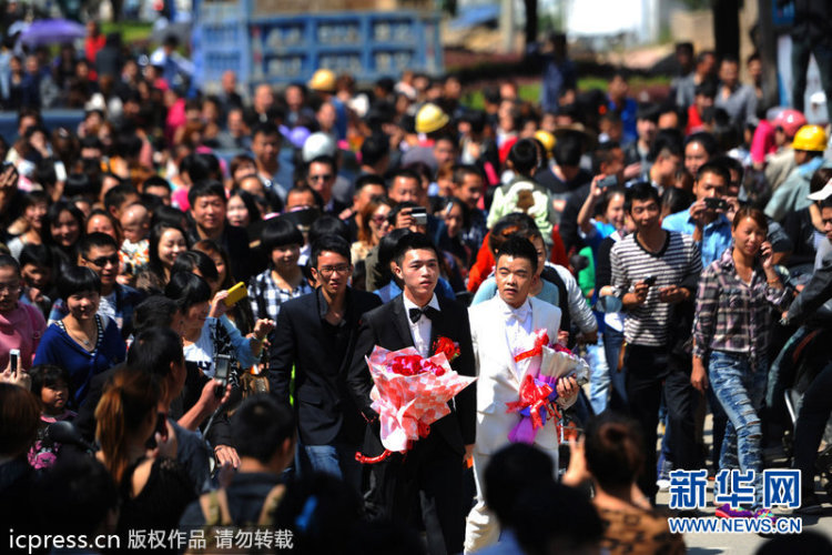 2012年10月2日,福建省最小的县城,宁德柘荣发生一件轰动全城的事情,一对男性同志在这个小县城里举行婚礼。当5辆电摩组成的迎亲队伍驶入十字街头时,全城沸腾。图为两人走在迎亲的队伍上,路上围观了近千人。