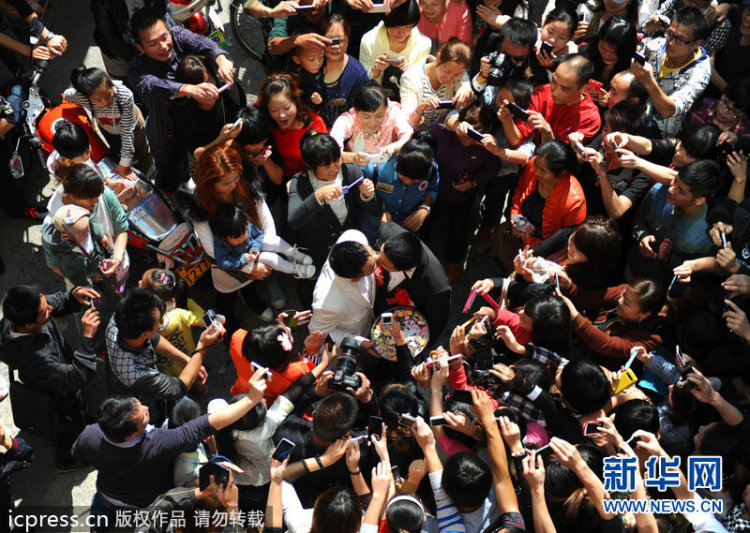 当5辆电摩组成的迎亲队伍驶入十字街头时,全城沸腾。骑电摩的、骑单车的、走路的,无不加大“油门”,紧跟在队伍后面,“迎亲”队伍瞬间达到近千人,一度造成交通拥堵。大家一边热聊,一边狂拍照片。虽然各种猜测仍在继续,但一场属于两人的特别婚礼已经完成了。