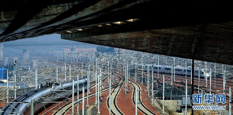 12月25日,两列动车组列车在郑州东站的站区内“相遇”。当日,京广高铁的各趟动车组列车均按照运行图全途运行,为12月26日全线正式投入运营做最后的调试准备。京广高铁北起北京,南至广州,是目前世界上运营里程最长的高速铁路。新华社记者王颂摄