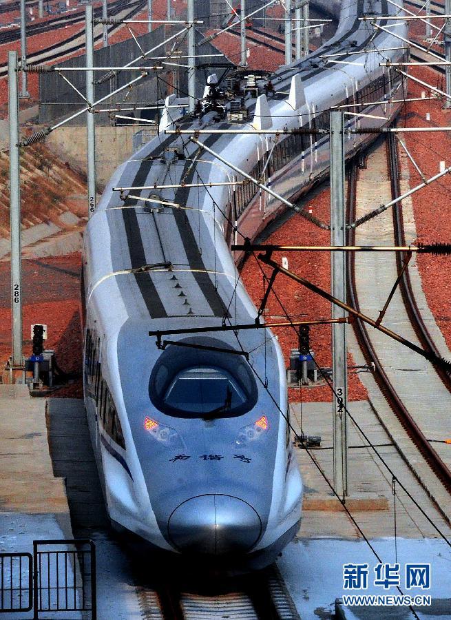 12月25日,一列由北京方向驶来的动车组列车驶进郑州东站。当日,京广高铁的各趟动车组列车均按照运行图全途运行,为12月26日全线正式投入运营做最后的调试准备。京广高铁北起北京,南至广州,是目前世界上运营里程最长的高速铁路。新华社记者王颂摄