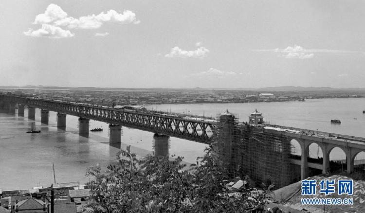 这是1957年拍摄的武汉长江大桥。这座横跨长江的第一座公路铁路两用大桥的通车将京汉铁路与粤汉铁路连成一体,正式更名为京广铁路。新华社记者 袁苓 摄