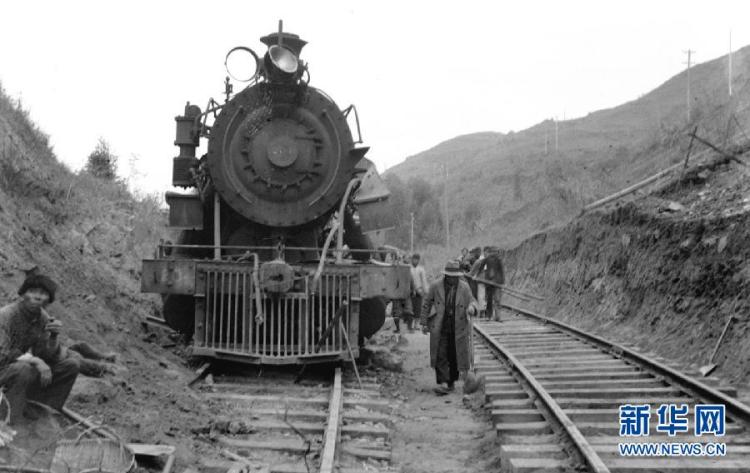 这是1938年拍摄的被日本飞机炸坏的粤汉铁路黎洞站北路轨和204号机车,其侧为刚修好的便道。 新华社发(陈其英摄)