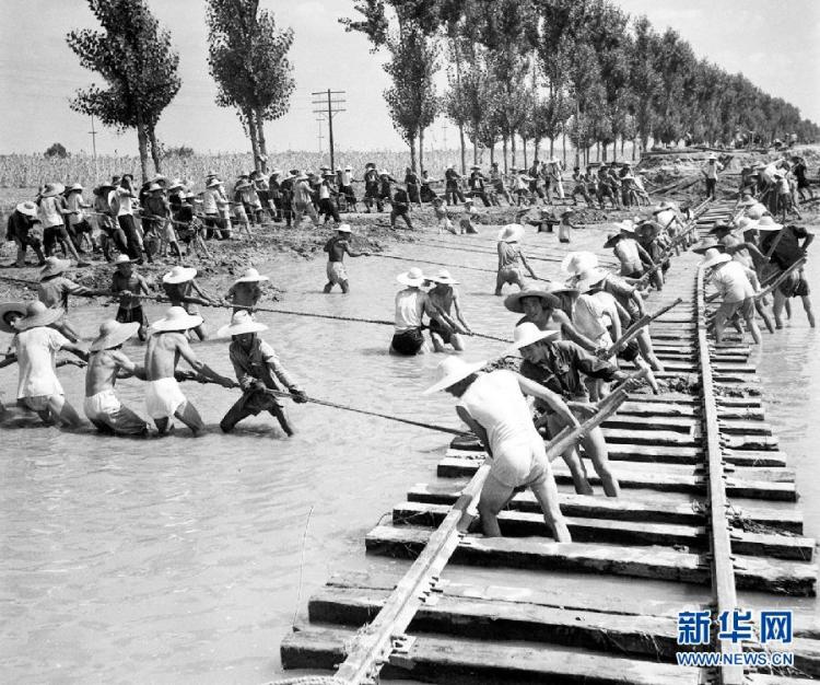 这是20世纪60年代,铁路工人们在抢修被洪水冲毁的京广铁路保定至定县段。 新华社记者 时盘棋 摄