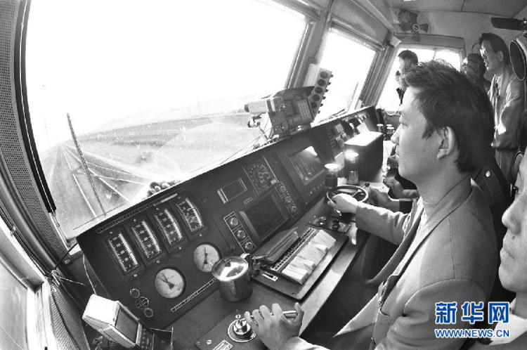 这是1996年京广铁路旅客列车进行提速试验,郑州铁路分局的左东亮在驾驶途中。 新华社记者 王颂 摄