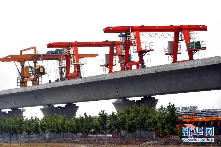 这是2010年6月3日,京广铁路客运专线石武高铁(河南段)新乡市境内的一处工地上在铺设铁轨。 新华社记者 王颂 摄