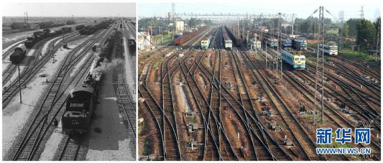 左图是20世纪50年代,陇海线上郑州火车站的货运情况。新华社记者 唐茂林 摄右图是2003年8月拍摄的郑州铁路北站编组站。新华社记者 朱祥 摄