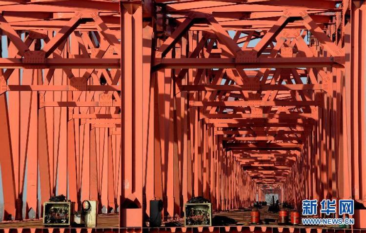 这是改建京广铁路跨越黄河特大型铁路桥工程施工工地(2012年11月26日摄)。 新华社记者 朱祥 摄