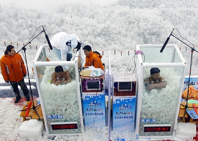 近年来国内外耐寒极限挑战大赛频频举行:2010年,荷兰硬汉霍夫把自己“冰藏”,置身冰块长达104分钟23秒创造了世界记录;2011年1月3日,张家界天门山顶的一场“耐寒大战”造就了以120分钟的“浸冰”时间刷新世界记录的金松浩;今年7月15日,天津极地海洋世界的“极地冰人大战”,崔德益以置身冰槽138分钟再次刷新世界纪录……记录一次次被刷新,人体耐寒极限也一次次被超越。