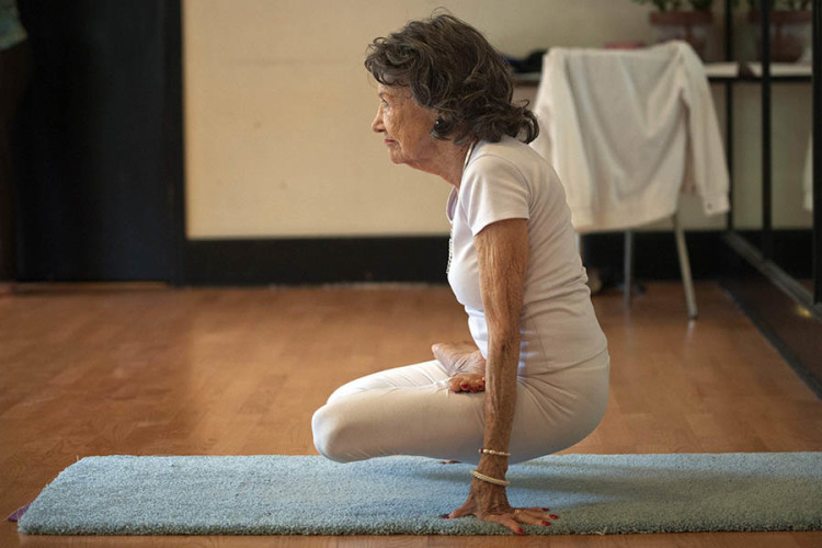 2012年5月14日,在美国纽约哈茨代尔,瑜珈教练林奇在教室里练瑜珈。现年93岁的林奇是世界上年龄最大的瑜珈教练。