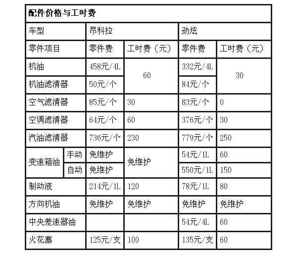 从下列表格可以看出,昂科拉的免维护项目比较多,而劲炫的工时费比较低,如果要分出一个胜负,长期而言,的确是昂科拉的保养费用会比较低一些。