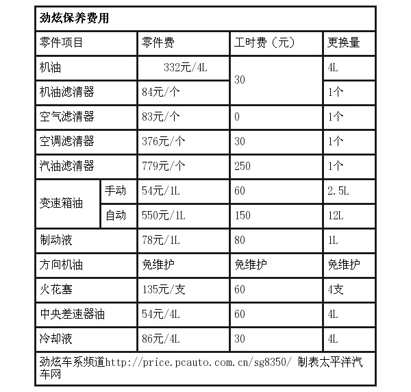 我们选取了劲炫2.0L四驱车型的配件以及工时费价格,结合下列表格为2.0L车型的保养周期最终得出6万公里的保养费用。