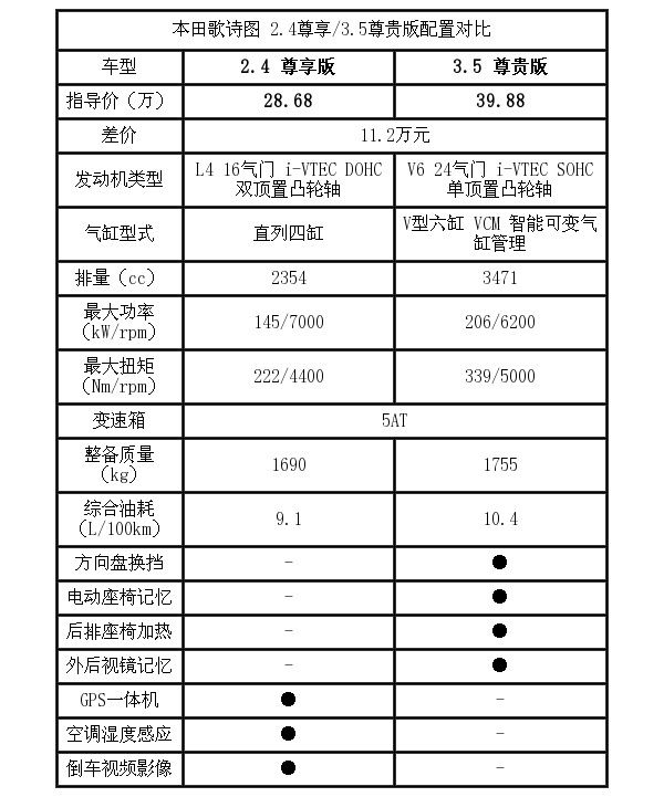 可见这11.2万差价大部分都是花在了动力升级上,3.5L V6相比2.4L L4在动力输出上确实有大幅提升,而特有VCM智能可变缸技术让3.5L发动机在油耗上也没有高出多少。一切看上去都很完美,大排量低油耗,只是11.2万都可以再买一台飞度了……