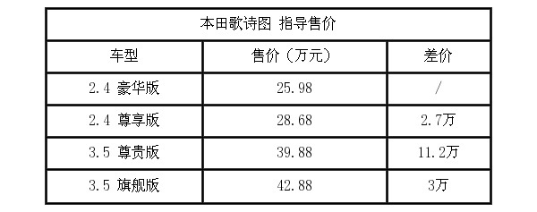 歌诗图每个版本之前差价都很大,3.5L和2.4L的差距居然来到了11.2万。这样的差距几乎使歌诗图的目标用户分裂成两个阶层,2.4L版本和雅阁类似,3.5L则要和宝马奥迪竞争,而本田的品牌价值这时候完全起不到帮助。