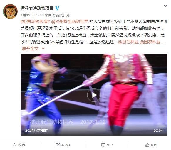 “很明显,从视频里可以看出,场上还有只老虎身上有伤,犬牙被拔掉。我觉得挺可恶的,当天晚上,我就在拯救表演动物项目的官方微博和公众平台发布视频,呼吁人们不观看表演,同时拨打市民热线等投诉。我们希望,杭州野生动物世界能做出回应和整改,最终的目的,是希望他们停止动物表演。”