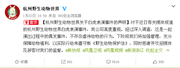 1月22日,杭州野生动物世界发布简短声明,称这是表演过程中的偶发事件,不存在虐待动物的行为。这个回应并不让胡春梅满意。