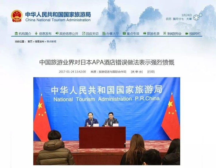 国家旅游局再次呼吁中国访日团组和广大游客,自觉抵制APA酒店的错误做法,不进该酒店消费。